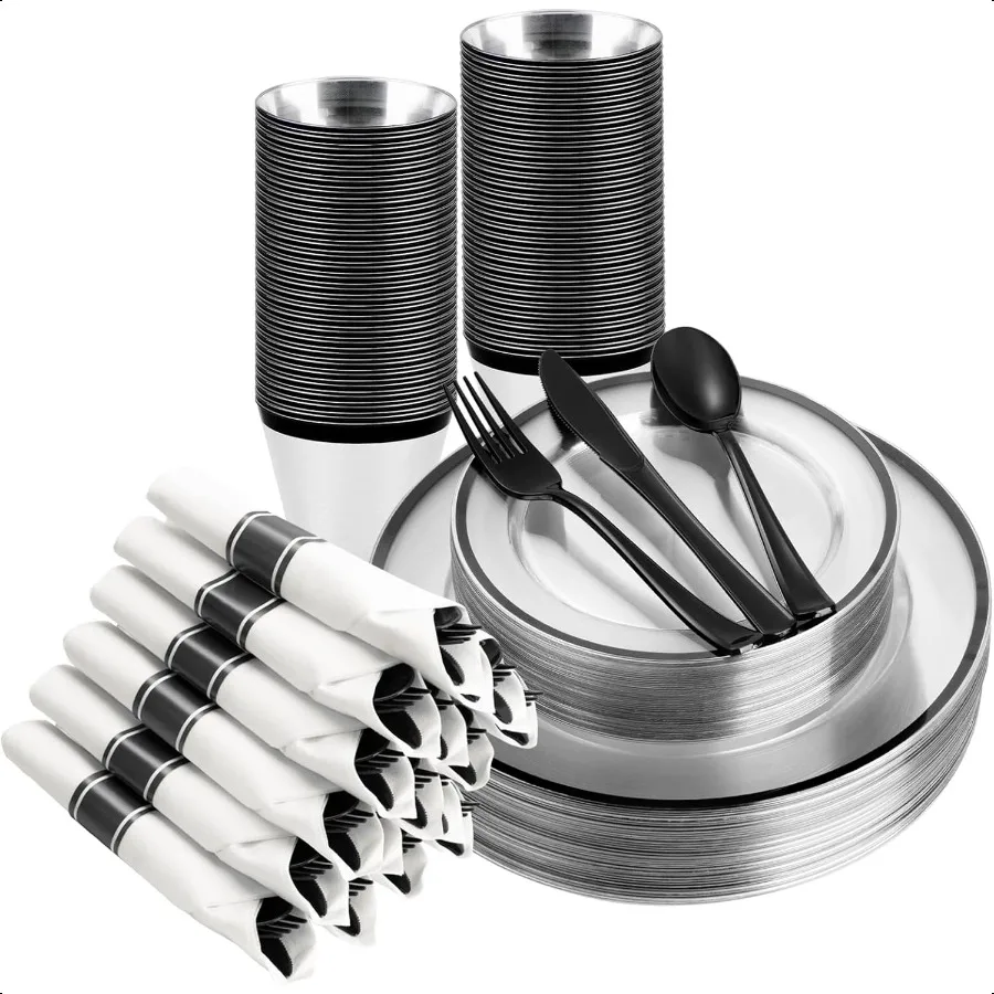 175PCS Clear and Black Plates Set for 25 Guests 50 Plastic Plates 25 Cups 25 PreRolled Napkins with Plastic Cutlery